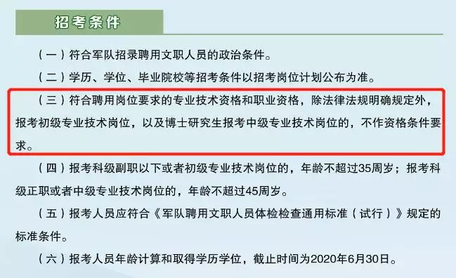 2020年軍隊(duì)文職招考預(yù)公告中對(duì)招考條件有所規(guī)定:報(bào)考人員需符合聘用崗位要求的專業(yè)技術(shù)資格和職業(yè)資格。